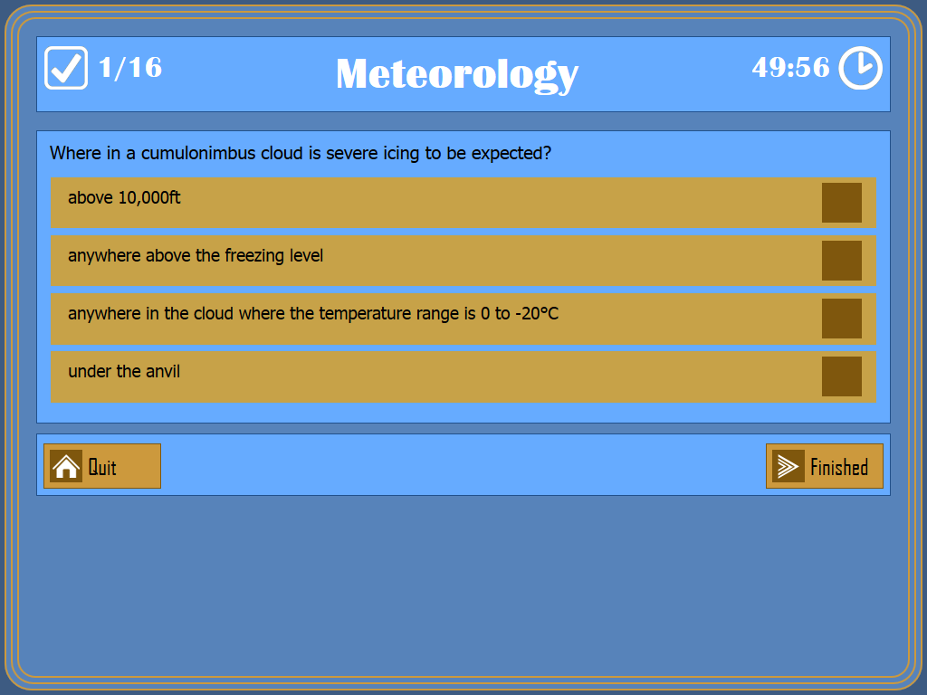 Meteorology is one of the larger revision subjects in the PPL course, and the size of the exam reflects this with 16 multiple choice questions to be answered in 50 minutes. At least 12 answers must be correct to meet the 75% pass mark.